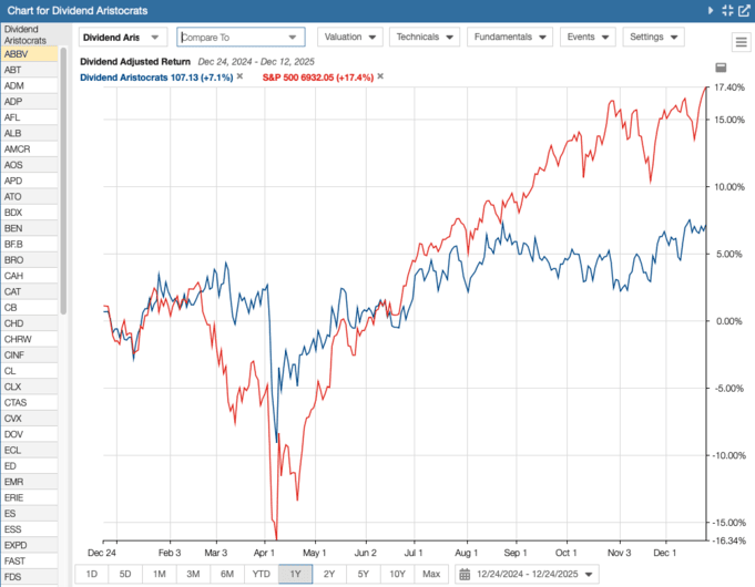 In the trailing 1-year, the Dividend Aristocrats 2025 returned +7.1% (blue line) compared to +17.4% for the S&P 500 Index (red line), as seen in the chart below. We used Stock Rover* to create this watchlist and chart. Over the trailing 5-years, the Dividend Aristocrats have returned +58.6%, and the S&P 500 Index has returned +101.3%.