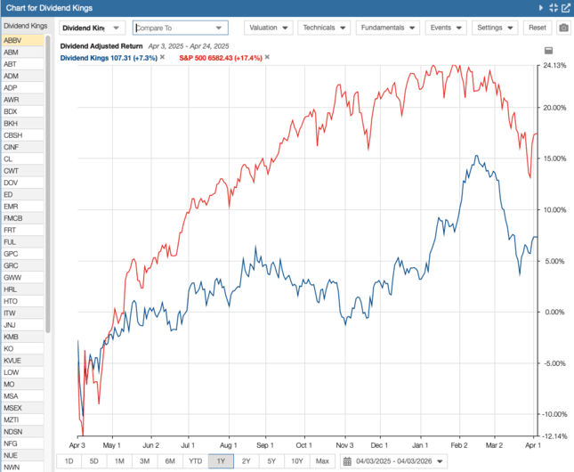 According to Stock Rover*, over the trailing 1-year period, the Dividend Kings have returned +7.3% (blue line) compared to +17.4% for the S&P 500 Index benchmark (red line), as seen in the chart below. Over the trailing 5-years, the Dividend Kings have returned +37.8%, while the S&P 500 Index has returned +75.4%.